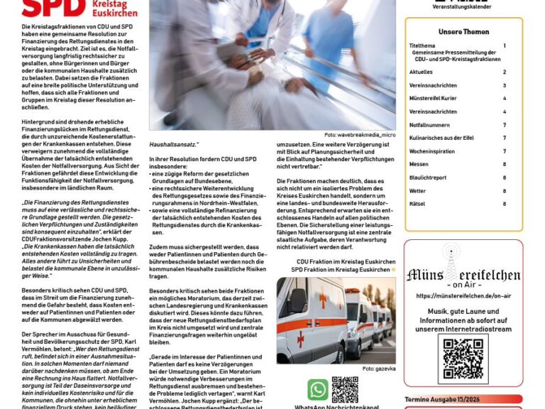 Die Fraktionen im Kreistag der CDU und der SPD positionieren sich zur zukünftigen Notfallversorgung im Kreis Euskirchen. In NRW werden…