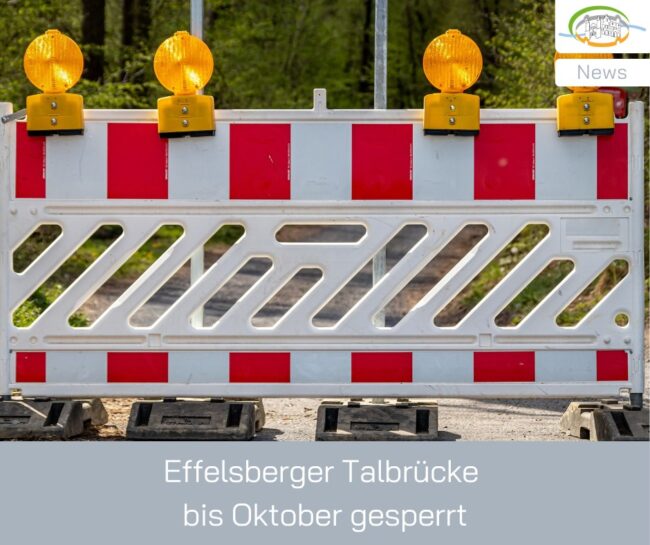 Im Rahmen der Sanierung der „Talbrücke Effelsberg“ wird die L 234 ab dem 24.03.2025 zwischen den Ortszufahrten „Letherter Landstraße“ und „Johannes-Kepler-Straße“ bis voraussichtlich Mitte Oktober gesperrt. Der Verkehr wird durch Beschilderung umgeleitet. Effelsberg und Lethert sowie das Radioteleskop werden weiterhin erreichbar sein. Das hat der Landesbetrieb Straßenbau NRW mitgeteilt, der die Baumaßnahme durchführt. Der Durchgangs-…