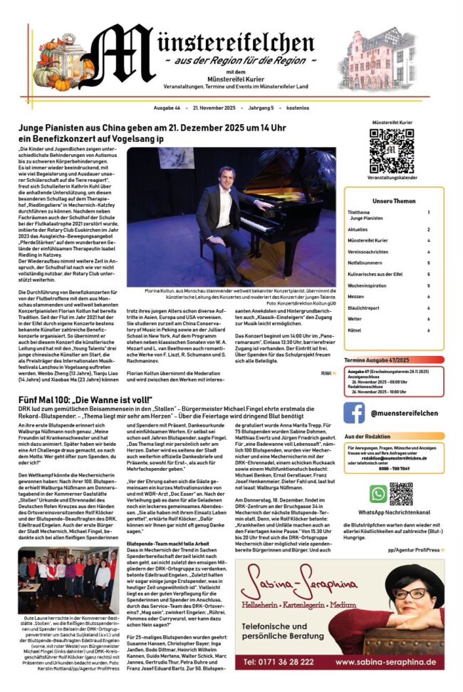 🎅 Weihnachtsmarkt 2025 🎁 Ab dem 21.11. um 11 Uhr startet der alljährliche Weihnachtsmarkt in Bad Münstereifel. Alle Infos auf einen Blick: 🌲 Über 30 Aussteller 🌲 Leckereien, Selbstgemachtes und Handwerkskunst 🌲 Kinderkarussell und Rahmenprogramm für Klein und Groß 🌲 Mo. – Do. 13-19 Uhr / Fr. + Sa. 11-20 Uhr / So. 11-19 Uhr…