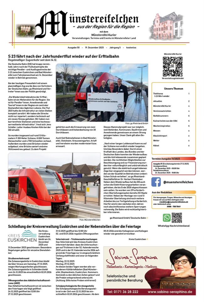 Nach langer Wartezeit fährt nun unsere S23 wieder bis Bad Münstereifel. Ohne großes Brimborium war sie dann wieder da und wird auch schon fleissig in Anspruch genommen. Das DRK Kreisverband Euskirchen beendet das Jahr 2025 mit einem versöhnlichen Rückblick und präsentiert sein Jahresprogramm 2026. Und zum Jahresabschluss gibt es auch noch Bewegung in dem heiß…