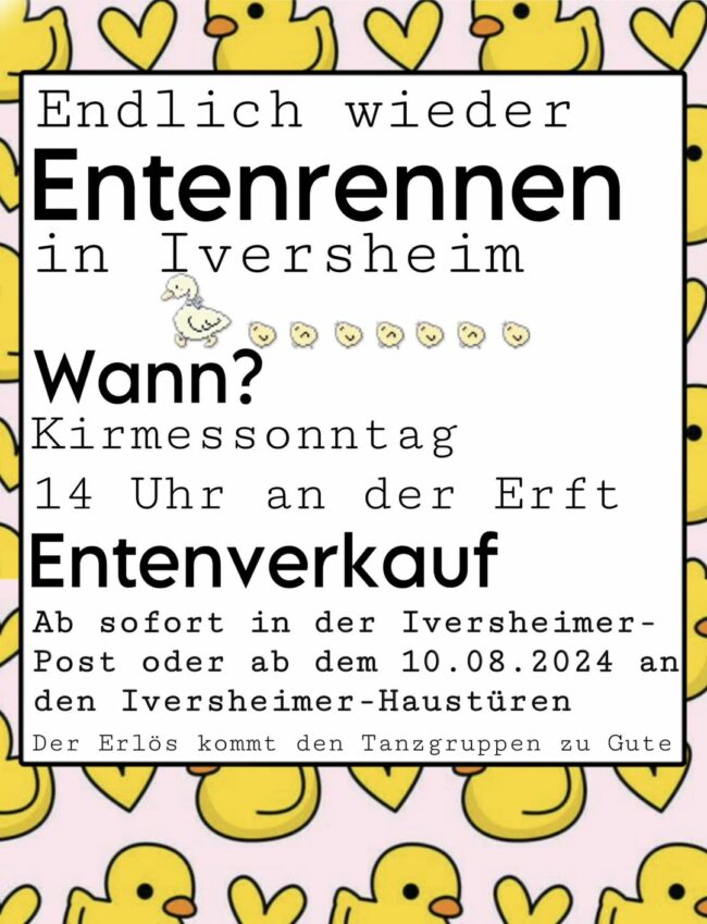 Dieses Jahr schwimmen sie wieder! Ententennen in Iversheim und dr Erlös geht an die Tanzgruppen im KG Rot-Weiss Iversheim 1996 e.V. Endlich wieder Entenrennen!!! 🦆 Source