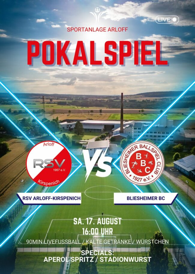 Nun rollt der Bal auch wieder in Arloff! RSV Arloff-Kirspenich Am Samstag um 16:00 Uhr ist es soweit! Unsere 1. Mannschaft bestreitet ihr erstes Pflichtspiel! 🎉 Es geht zu Hause gegen den Bliesheimer BC aus der Kreisliga B! ⚽️ Wie immer freuen wir uns über eure zahlreiche & lautstarke Unterstützung von der Seitenlinie aus. Als…