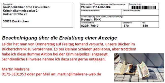 Das ist super ärgerlich. Heute Morgen bekam ich von einer aufmerksamen Spaziergängerin den Hinweis, dass verbrannte Bücher in unserem Dorfbücherschrank liegen würden. Zum Glück ist der ganze Schrank nicht abgefackelt. Wir säubern jetzt den Bücherschrank, hier vielen Dank an Helga und Conny. Der Vorfall ist bei der Kriminalpolizei zur Anzeige gebracht worden. Hoffentlich können wir…