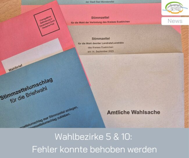 Der Stadt Bad Münstereifel ist ein Fehler beim Versenden der Briefwahlunterlagen für die Stimmbezirke 5 (Nöthen, Hohn) und 10 (Eicherscheid) unterlaufen: Einem Teil der Briefwahlunterlagen wurde am 19.08.2025 der falsche Stimmzettel für die Wahl des Stadtrates beigefügt. Die betroffenen Wahlberechtigten wurden von der Stadtverwaltung bereits identifiziert und informiert, so dass die Stimmzettel kurzfristig ausgetauscht werden…