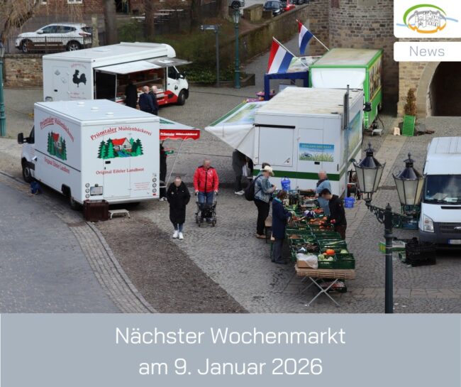 Der Wochenmarkt vor der Stiftskirche in Bad Münstereifel fällt sowohl am Freitag, 26. Dezember 2025, als auch am Freitag, 2. Januar 2026 aus.Am Freitag, 9. Januar 2026 werden wieder Käse, Geflügel und Backwaren erhältlich sein. Ab dem 16. Januar kommen wieder Fleisch und Gemüse hinzu. Der Blumenstand wird bis zum Frühjahr pausieren. Source