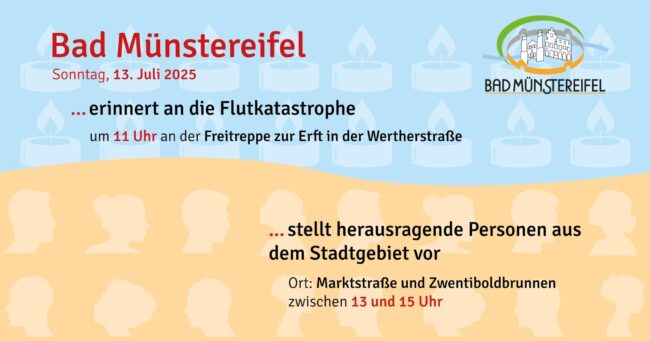 🕯 Erinnern, Zusammenstehen, Gemeinsam nach vorne blicken 💛 Vier Jahre nach der Flutkatastrophe lädt Bürgermeisterin Sabine Preiser-Marian alle Bürgerinnen und Bürger, Helferinnen und Helfer sowie Freundinnen und Freunde der Stadt Bad Münstereifel herzlich ein zur Erinnerungsstunde am Sonntag, 13. Juli 2025, um 11 Uhr an der Freitreppe in der Wertherstraße. Wie wollen uns gemeinsam erinnern…