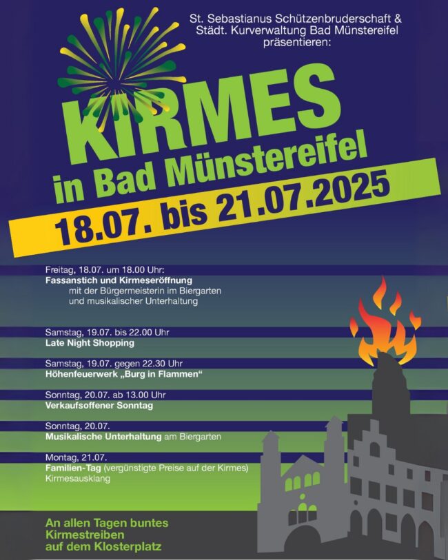 🎡 Kirmeszeit in Bad Münstereifel! 🎠 Ab Freitag, 18. Juli, heißt es wieder: Spaß, Musik und Kirmesfeeling pur in unserer Stadt! 🎉 Die offizielle Eröffnung findet um 18 Uhr am Biergarten vor der Pfarrkirche St. Chrysanthus und Daria statt – mit Fassanstich durch Bürgermeisterin Sabine Preiser-Marian und Musik zum Start ins Wochenende. 🎶🍺 Für Kinder…