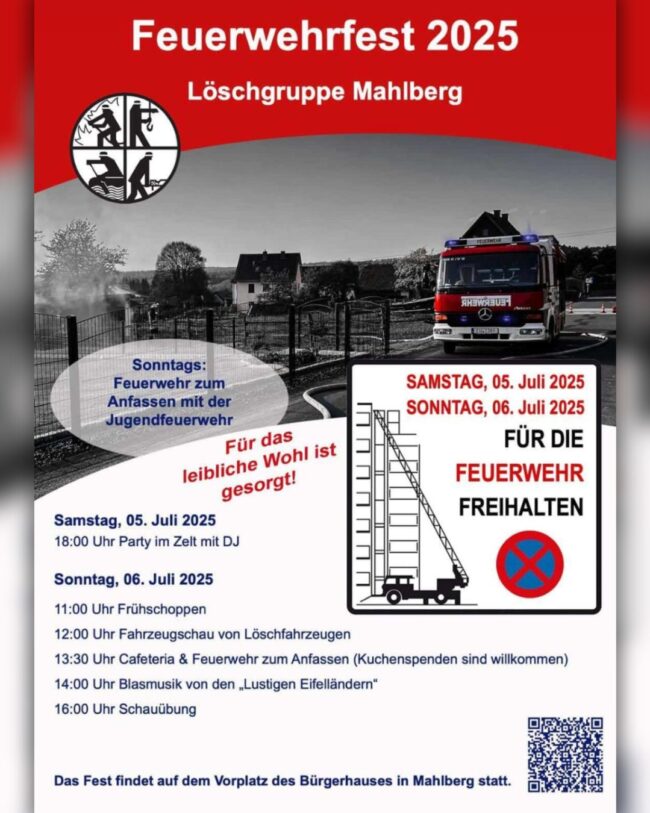 🚨🚒 Feuerwehrfest der Löschgruppe Mahlberg 🚒🚨 Zum Feuerwehrfest lädt die Löschgruppe Mahlberg der Freiwilligen Feuerwehr Bad Münstereifel recht herzlich an das Bürgerhaus in Mahlberg ein. 📆 Samstag, 05. Juli 2025: 19:30 Uhr: Party im Zelt mit DJ 📆 Sonntag, 06. Juli 2025: ab 11:00 Uhr: Frühschoppen ab 12:00 Uhr: Fahrzeugschau ab 13:30 Uhr: Kaffee und…