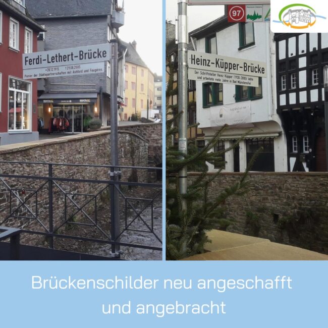 Wiederbeschilderung unserer Brücken! 🌉 Nach den Schäden durch die Flut sind die Schilder der „Ferdi-Lethert-Brücke“ und der „Heinz-Küpper-Brücke“ endlich zurück! Ferdi Lethert (1915–2005) war Lehrer am St.-Michael-Gymnasium und Ratsmitglied, der mit den Städtepartnerschaften von Bad Münstereifel wichtige internationale Brücken baute. Sein Einsatz brachte ihm den britischen Verdienstorden (MBE) und die Ehrenbürgerschaft von Ashford. Heinz Küpper…