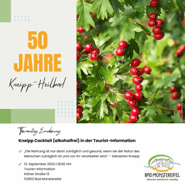 Seit genau 50 Jahren darf Bad Münstereifel sich „Kneipp-Heilbad“ nennen. 😍 Anlässlich dieses Jubiläums finden vom 9. bis zum 13. September 2024 fünf Schnuppertage statt, die sich jeweils auf eine der fünf Säulen nach Kneipp beziehen: 📆 9. September: Thementag „Balance“ – Der Weg zur Kneipp-Kur – Vortrag mit Badearzt Johannes-Peter Klein 📆 10. September:…
