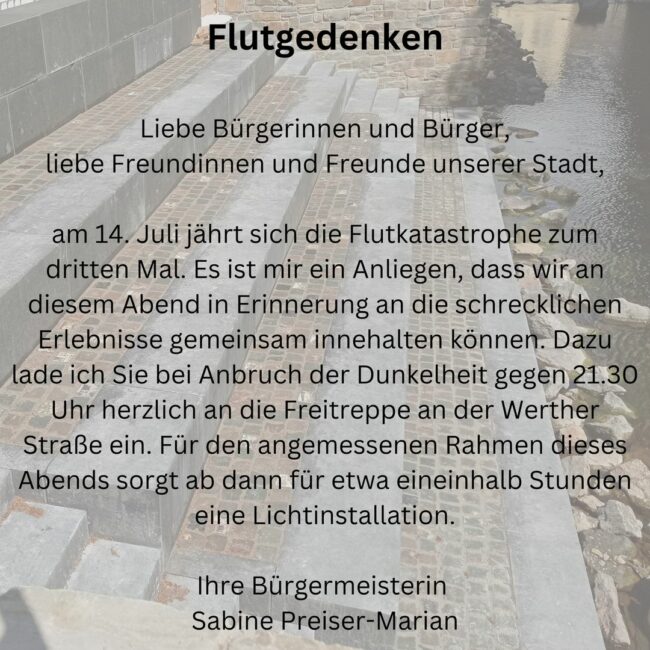 In wenigen Tagen jährt sich der Jahrestag der Flutkatastrophe vom 14./15. Juli 2021 zum dritten Mal. „Es ist mir ein Anliegen, dass wir an diesem Abend in Erinnerung an die schrecklichen Erlebnisse gemeinsam innehalten können.“ Mit diesen Worten wendet sich Bürgermeisterin Sabine Preiser-Marian an die Bürgerinnen und Bürger sowie die Freundinnen und Freunde Bad Münstereifels.…