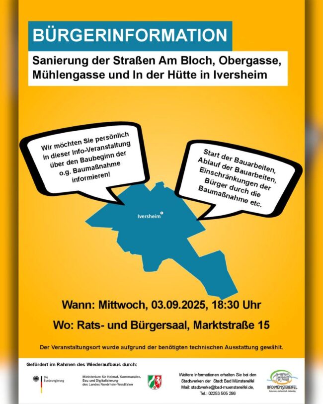 Von der Flutkatastrophe am 14./15. Juli 2021 war auch Iversheim stark betroffen. Der Wiederaufbau der überfahrbaren Brücken ist bereits abgeschlossen, die Sanierung des ersten Abschnitts der Erftmauern im Bereich „Auf dem Waasem“ ist im Gange. In Kürze werden auch die Arbeiten in der Straße „In der Hütte“ und in der Mühlengasse beginnen. Die Straße „Am…