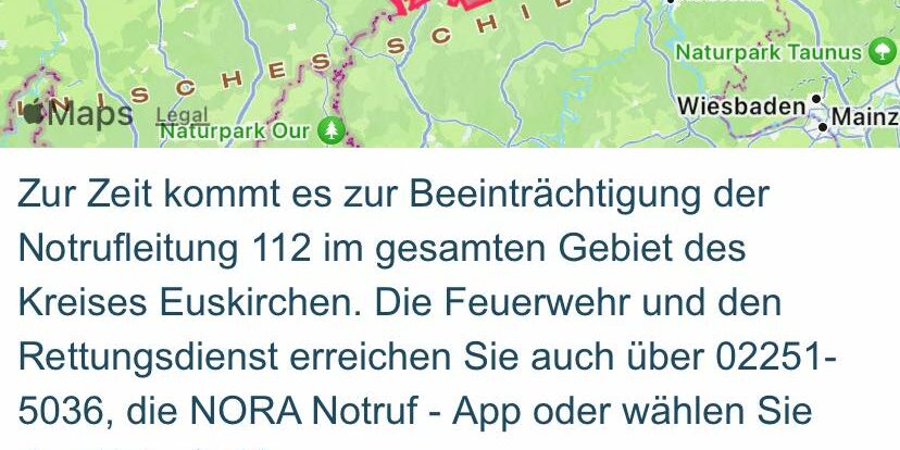 Sep.102024Münstereifelchen aktuell Der Notruf im Kreis Euskirchen funktioniert wieder! +++ Beeinträchtigung Notfallrufnummer im Kreis Euskirchen +++ #badmünstereifel #Münstereifelchen #badmuenstereifel Source Ähnliche Beiträge Category: Münstereifelchen aktuellVon Redaktion10. September 2024 Autor: Redaktion https://muenstereifelchen.de KommentarnavigationZurückVorheriger Beitrag:POL-EU: Fahrer flüchtete vergebens – Fahrzeug sichergestelltNächstesNächster Beitrag:50 Jahre Kneipp-Heilbad Bad Münstereifel Heute: Thementag „Kräuter“ Kräuter u…Related postsDer „historische“ 09. November! Vielleicht der „deutscheste“ Tag im Jahr, weil s…9. November 2025Der letzte Bioladen in Bad Münstereifel wird wohl zum Ende des Jahres geschlosse…8. November 2025Die Züge rollen wieder durch die Eifel. Die Wiederherstellung, der während der F…7. November 2025+++ WARNUNG vor Rauchgasentwicklung +++ In der Ortslage Mechernich kommt es zu …4. November 2025+++ Entwarnung +++ Das Trinkwasser in Tondorf kann wieder uneingeschränkt genut…31. Oktober 2025𝙒𝙞𝙘𝙝𝙩𝙞𝙜𝙚 𝘽𝙚𝙫𝙤̈𝙡𝙠𝙚𝙧𝙪𝙣𝙜𝙨𝙞𝙣𝙛𝙤𝙧𝙢𝙖𝙩𝙞𝙤𝙣 – 𝘼𝙗𝙠𝙤𝙘𝙝𝙜𝙚𝙗𝙤𝙩 𝙛𝙪̈𝙧 𝙙𝙞𝙚 𝙊𝙧𝙩𝙨𝙡𝙖𝙜𝙚 𝙏𝙤𝙣𝙙𝙤𝙧𝙛 𝙞𝙣 𝙙𝙚𝙧…24. Oktober 2025