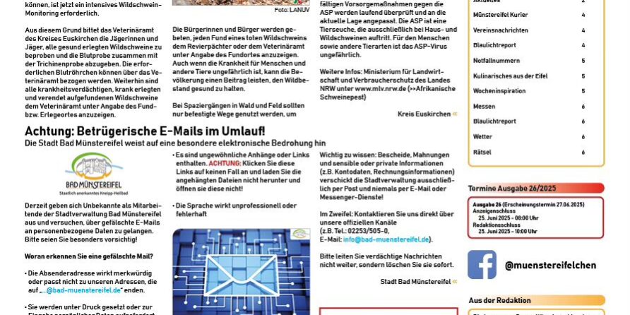 Juni202025Münstereifelchen aktuell Die aktuelle Ausgabe liegt online bereit zum Lesen. https://xn--mnstereifelchen-zvb.de/ Source Ähnliche Beiträge Category: Münstereifelchen aktuellVon Redaktion20. Juni 2025 Autor: Redaktion https://muenstereifelchen.de KommentarnavigationZurückVorheriger Beitrag:POL-EU: Motorradkontrollen an Fronleichnam – Zu schnelles Fahren lohnt sich nichtNächstesNächster Beitrag:POL-EU: Illegales Autorennen endet im Gebüsch – 17-Jähriger flüchtet vergebensRelated postsDer 2. Advent steht bei uns im Zeichen der Ehrenamtlichen Arbeit. Der Ehrenamtsp…6. Dezember 2025Das 1. Adventswochenende naht. Damit nimmt auch die Anzahl der Weihnachtsmärkte …28. November 2025Der Weihnachtsmarkt in Bad Münstereifel ist eröffnet und bleibt bis zum 30. Deze…21. November 2025Die Durchfahrt des Heisterbacher Tores in der Kernstadt ist wieder für den motor…21. November 2025Spenden ist in der Weihnachtszeit ein großes Thema – dies gilt auch beim Thema B…21. November 2025Im Kreis Euskirchen ist ein zweiter Fall der Geflügelpest bestätigt worden, eben…19. November 2025
