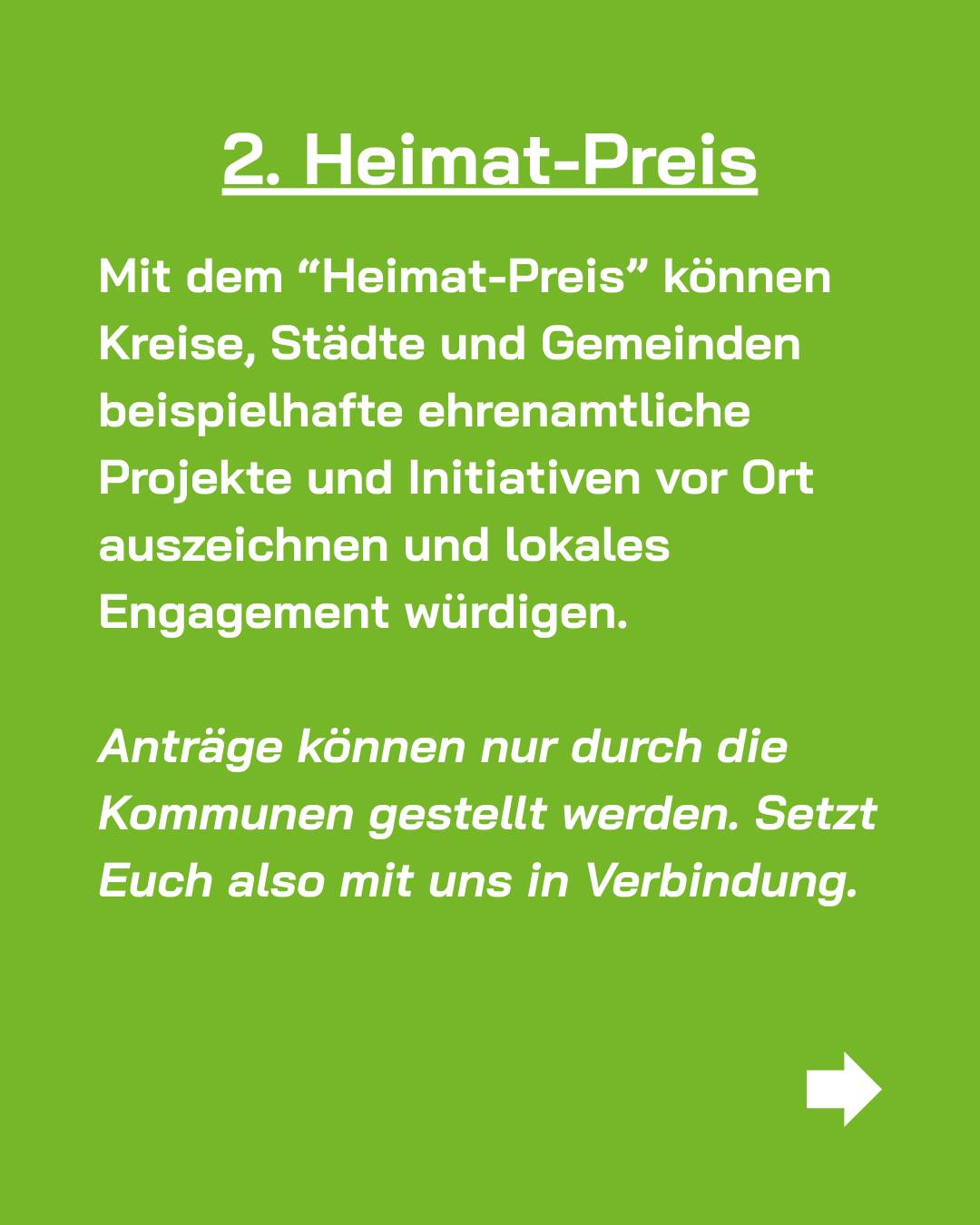 2️⃣ Heimat-Preis: Auszeichnung beispielhafter ehrenamtlicher Projekte vor Ort. Anträge können nur von den Kommunen eingereicht werden.