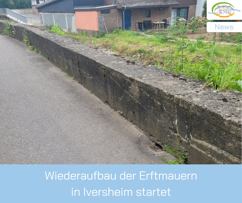 In Iversheim startet der Wiederaufbau der Erftmauern, die durch die Flutkatastrophe 2021 beschädigt wurden. Zunächst wird der Bereich an der Straße „Auf dem Waasem“ ab der Brücke „Alte Gasse“ in Fließrichtung der Erft saniert. Laut Mitteilung der beauftragten Baufirma soll die Aufstellung des Gerüsts in der Woche zwischen dem 28. Juli und 1. August 2025 stattfinden. Die Sanierung soll dann zeitnah beginnen und rund vier Monate dauern. Im Rahmen der Maßnahme wird die Mauer unter anderem auf 90 Zentimeter erhöht werden. Die Befahrbarkeit der Straße während der Bauzeit wird sichergestellt. Die Instandsetzungsmaßnahmen der übrigen Iversheimer Erftmauern sind in der Planung und werden später erfolgen.