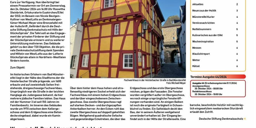Okt.252024Münstereifelchen aktuell Unsere aktuelle Ausgabe liegt online bereit zum Lesen. https://xn--mnstereifelchen-zvb.de/ Source Ähnliche Beiträge Category: Münstereifelchen aktuellVon Redaktion25. Oktober 2024 Autor: Redaktion https://muenstereifelchen.de KommentarnavigationZurückVorheriger Beitrag:POL-EU: Alkoholisiert unterwegs | PresseportalNächstesNächster Beitrag:Verlegung des Wochenmarktes in der kommenden Woche Stadt Bad Münstereifel #bad…Related postsDer 2. Advent steht bei uns im Zeichen der Ehrenamtlichen Arbeit. Der Ehrenamtsp…6. Dezember 2025Das 1. Adventswochenende naht. Damit nimmt auch die Anzahl der Weihnachtsmärkte …28. November 2025Der Weihnachtsmarkt in Bad Münstereifel ist eröffnet und bleibt bis zum 30. Deze…21. November 2025Die Durchfahrt des Heisterbacher Tores in der Kernstadt ist wieder für den motor…21. November 2025Spenden ist in der Weihnachtszeit ein großes Thema – dies gilt auch beim Thema B…21. November 2025Im Kreis Euskirchen ist ein zweiter Fall der Geflügelpest bestätigt worden, eben…19. November 2025