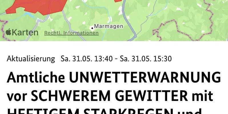 Mai312025Münstereifelchen aktuell +++ Unwetterwarnung für den Landkreis Euskirchen +++ #badmünstereifel #heimat #Münstereifelchen #Euskirchen Source Ähnliche Beiträge Category: Münstereifelchen aktuellVon Redaktion31. Mai 2025 Autor: Redaktion https://muenstereifelchen.de KommentarnavigationZurückVorheriger Beitrag:POL-EU: Alkoholisierter Radfahrer bei Sturz verletztNächstesNächster Beitrag:Der Deutsche Wetterdienst (DWD) hat soeben eine amtliche Unwetterwarnung für den…Related postsDer 2. Advent steht bei uns im Zeichen der Ehrenamtlichen Arbeit. Der Ehrenamtsp…6. Dezember 2025Das 1. Adventswochenende naht. Damit nimmt auch die Anzahl der Weihnachtsmärkte …28. November 2025Der Weihnachtsmarkt in Bad Münstereifel ist eröffnet und bleibt bis zum 30. Deze…21. November 2025Die Durchfahrt des Heisterbacher Tores in der Kernstadt ist wieder für den motor…21. November 2025Spenden ist in der Weihnachtszeit ein großes Thema – dies gilt auch beim Thema B…21. November 2025Im Kreis Euskirchen ist ein zweiter Fall der Geflügelpest bestätigt worden, eben…19. November 2025