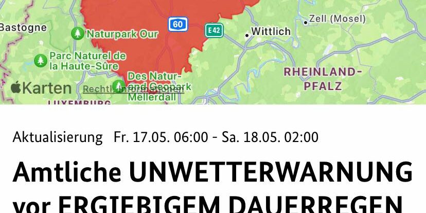 Mai162024Münstereifelchen aktuell +++ Unwetterwarnung vor ergiebigem Dauerregen +++ Source Ähnliche Beiträge Category: Münstereifelchen aktuellVon Redaktion16. Mai 2024 Autor: Redaktion https://muenstereifelchen.de KommentarnavigationZurückVorheriger Beitrag:Der Kreis Euskirchen bietet erneut einen Termin des Sanierungstreffs an. 𝗦𝗮𝗻𝗶𝗲𝗿𝘂…NächstesNächster Beitrag:POL-EU: 85-Jährige auf Gehweg verletztRelated postsDer „historische“ 09. November! Vielleicht der „deutscheste“ Tag im Jahr, weil s…9. November 2025Der letzte Bioladen in Bad Münstereifel wird wohl zum Ende des Jahres geschlosse…8. November 2025Die Züge rollen wieder durch die Eifel. Die Wiederherstellung, der während der F…7. November 2025+++ WARNUNG vor Rauchgasentwicklung +++ In der Ortslage Mechernich kommt es zu …4. November 2025+++ Entwarnung +++ Das Trinkwasser in Tondorf kann wieder uneingeschränkt genut…31. Oktober 2025𝙒𝙞𝙘𝙝𝙩𝙞𝙜𝙚 𝘽𝙚𝙫𝙤̈𝙡𝙠𝙚𝙧𝙪𝙣𝙜𝙨𝙞𝙣𝙛𝙤𝙧𝙢𝙖𝙩𝙞𝙤𝙣 – 𝘼𝙗𝙠𝙤𝙘𝙝𝙜𝙚𝙗𝙤𝙩 𝙛𝙪̈𝙧 𝙙𝙞𝙚 𝙊𝙧𝙩𝙨𝙡𝙖𝙜𝙚 𝙏𝙤𝙣𝙙𝙤𝙧𝙛 𝙞𝙣 𝙙𝙚𝙧…24. Oktober 2025