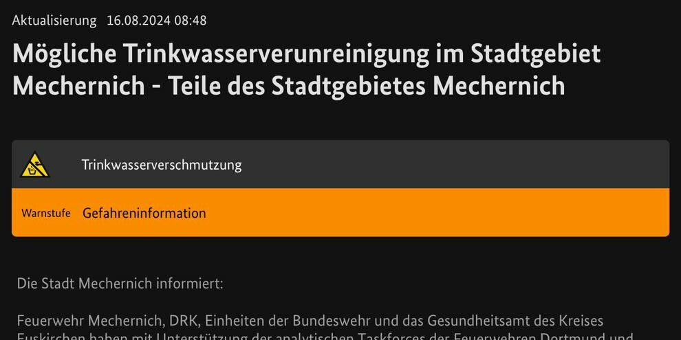 Aug.162024Münstereifelchen aktuell +++ Update zur Trinkwasserversorgung in Mechernich +++ Stand: 16.08.2024 – 08:48 Uhr Quell: NINA Source Ähnliche Beiträge Category: Münstereifelchen aktuellVon Redaktion16. August 2024 Autor: Redaktion https://muenstereifelchen.de KommentarnavigationZurückVorheriger Beitrag:+++ Warnung vor möglicher Trinkwasserverschmutzung in Teilen des Stadtgebietes M…NächstesNächster Beitrag:POL-EU: Maschendrahtzaun beschädigt | PresseportalRelated postsSeit einigen Monaten wird im Bereich des Wallgrabens gebaggert, gebaut, gestalte…16. Dezember 2025Da ist er wieder! Endlich wieder mit der Deutschen Bahn nach Bad Münstereifel …14. Dezember 2025Mit dem Winterfahrplan bekommt Bad Münstereifel nun auch endlich seine Zugverbin…12. Dezember 2025Der 2. Advent steht bei uns im Zeichen der Ehrenamtlichen Arbeit. Der Ehrenamtsp…6. Dezember 2025Das 1. Adventswochenende naht. Damit nimmt auch die Anzahl der Weihnachtsmärkte …28. November 2025Der Weihnachtsmarkt in Bad Münstereifel ist eröffnet und bleibt bis zum 30. Deze…21. November 2025