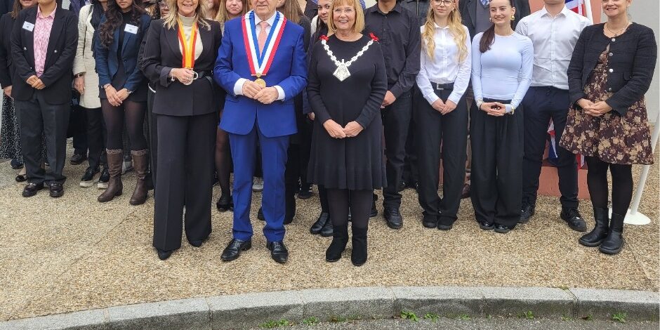 ◾ Samstag: Gedenk‑Kranzniederlegung am Grab von Mimi Reno, Gründer der Städtepartnerschaft, gefolgt von der feierlichen Zeremonie im ehemaligen Schuhfabrik‑Komplex „Les Ateliers“. Die Jugendlichen aus allen drei Städten präsentierten kreative Projekte zum Weitergeben von materiellem und immateriellem Erbe. Anschließend redeten Bürgermeister Louis Feuvrier (Fougères), Lyn Suddards (Ashford) und Sabine Preiser‑Marian, und wir überreichten kleine Geschenke.