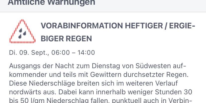 Der DWD gibt eine Vorabinformation zu ergiebigen Regenfällen am 09. September 2025.