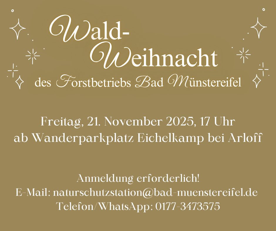 Die dunkle Jahreszeit ist gleichzeitig die Zeit der Lichter. In diesem Jahr wird sie schon zum fünften Mal mit der „Wald-Weihnacht“ des Forstbetriebs der Stadt Bad Münstereifel eingeläutet. 🎄 Dazu lädt Revierförsterin Julia Bongartz ein für Freitag, 21.11.2025. Los geht es um 17 Uhr am Wanderparkplatz Eichelkamp südlich von Arloff (https://maps.app.goo.gl/zXmY24f41BuJKrAq8).