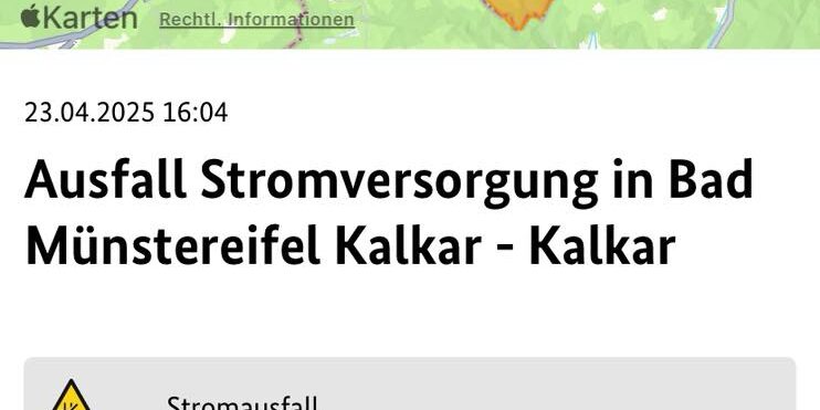 Nachdem im Laufe des Nachmittags in Teilen von Bad Münstereifel Stadt immer wieder der Strom ausgefallen ist, wurde soeben von der Stadt Bad Münstereifel eine offizielle Warnung für einen Stromausfall im OT Kalkar veröffentlich.