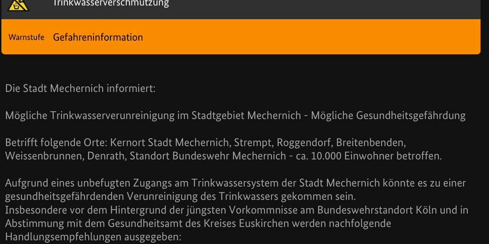 Aug.152024Münstereifelchen aktuell +++ Warnung vor möglicher Trinkwasserverschmutzung in Teilen des Stadtgebietes Mechernich +++ Quelle: NINA Source Ähnliche Beiträge Category: Münstereifelchen aktuellVon Redaktion15. August 2024 Autor: Redaktion https://muenstereifelchen.de KommentarnavigationZurückVorheriger Beitrag:POL-EU: Ein Polizeimärchen: Echter Polizist verhindert Betrug von „falschen Polizisten“NächstesNächster Beitrag:+++ Update zur Trinkwasserversorgung in Mechernich +++ Stand: 16.08.2024 – 08:4…Related posts2026 bringt mehr Geld für Familien! Erfahrt jetzt, wie Kindergeld, steuerliche …18. Januar 2026Stromausfall? – Nicht bei uns! Kann leider aber dennoch einmal passiert und dah…16. Januar 2026Am Samstag, 17.01.2026, muss die Erftbrücke am Sittarweg in der Zeit von 6:00 bi…12. Januar 2026+++ Aufhebung der Unwetterwarnung +++ #badmünstereifel #heimat #Münstereifelche…12. Januar 2026+++ Amtliche War und vor Glatteis +++ Der DWD hat die Vorwarnung nunmehr konkre…11. Januar 2026+++ Distanzunterricht am 12.01.2026 +++ Durch das Schulministerium NRW wurde fü…11. Januar 2026