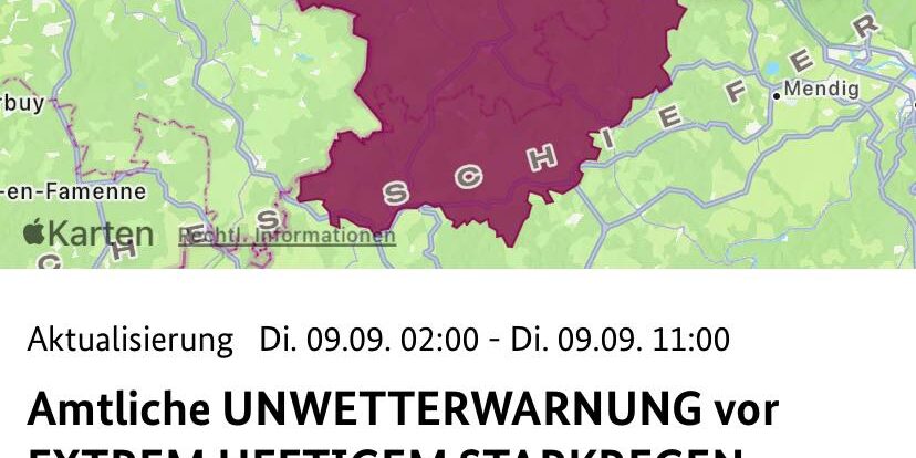 Der DWD hat das Unwetter weiter hochgeistige auf nunmehr auf EXTREM HEFTIGER STARKREGEN (Stufe 4). Gerade in Staulagen kann es dabei zu Niederschlägen zwischen 50 und 80 Litern pro Quadratmeter kommen!