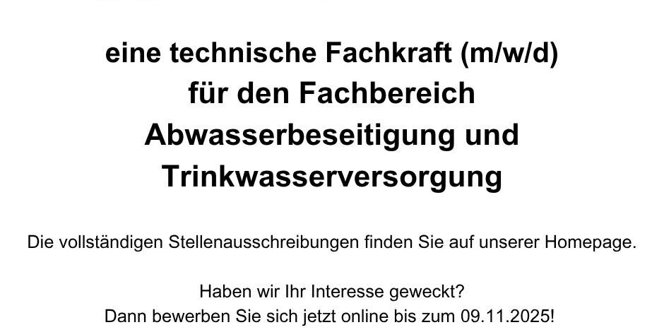 ◼️ eine technische Fachkraft (m/w/d)für den Fachbereich Abwasserbeseitigung und Trinkwasserversorgung
