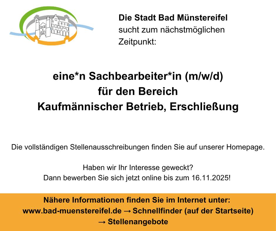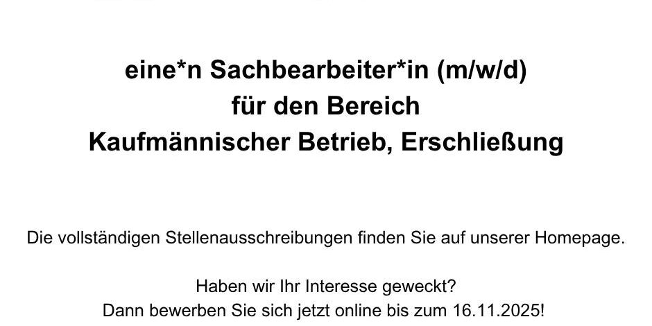 ◼️ eine*n Sachbearbeiter*in (m/w/d)für den Bereich Kaufmännischer Betrieb, Erschließung
